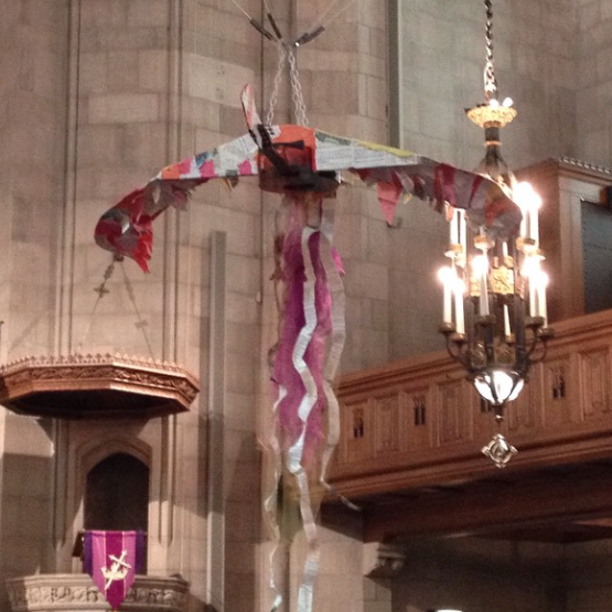 For closing worship on Wednesday, the representation of a bird was hung from the ceiling of the sanctuary—made mostly of strips of paper (taken from old hymnals) where we wrote our prayers earlier in the week. And then during the service, these words were offered: