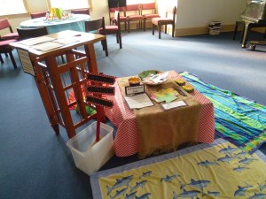 Earlier this summer I ran across the work of Lilly Lewin at Free Range Worship. She was the worship leader at the Intergenerate Conference in Nashville and had set up a room under the theme Tables with Jesus, where each table had a different theme from the life of Jesus that engaged the viewer in thoughtful reflection and action. Most of the tables use objects that can be found around the home and all the signs and instructions are available for a reasonable price on her website.