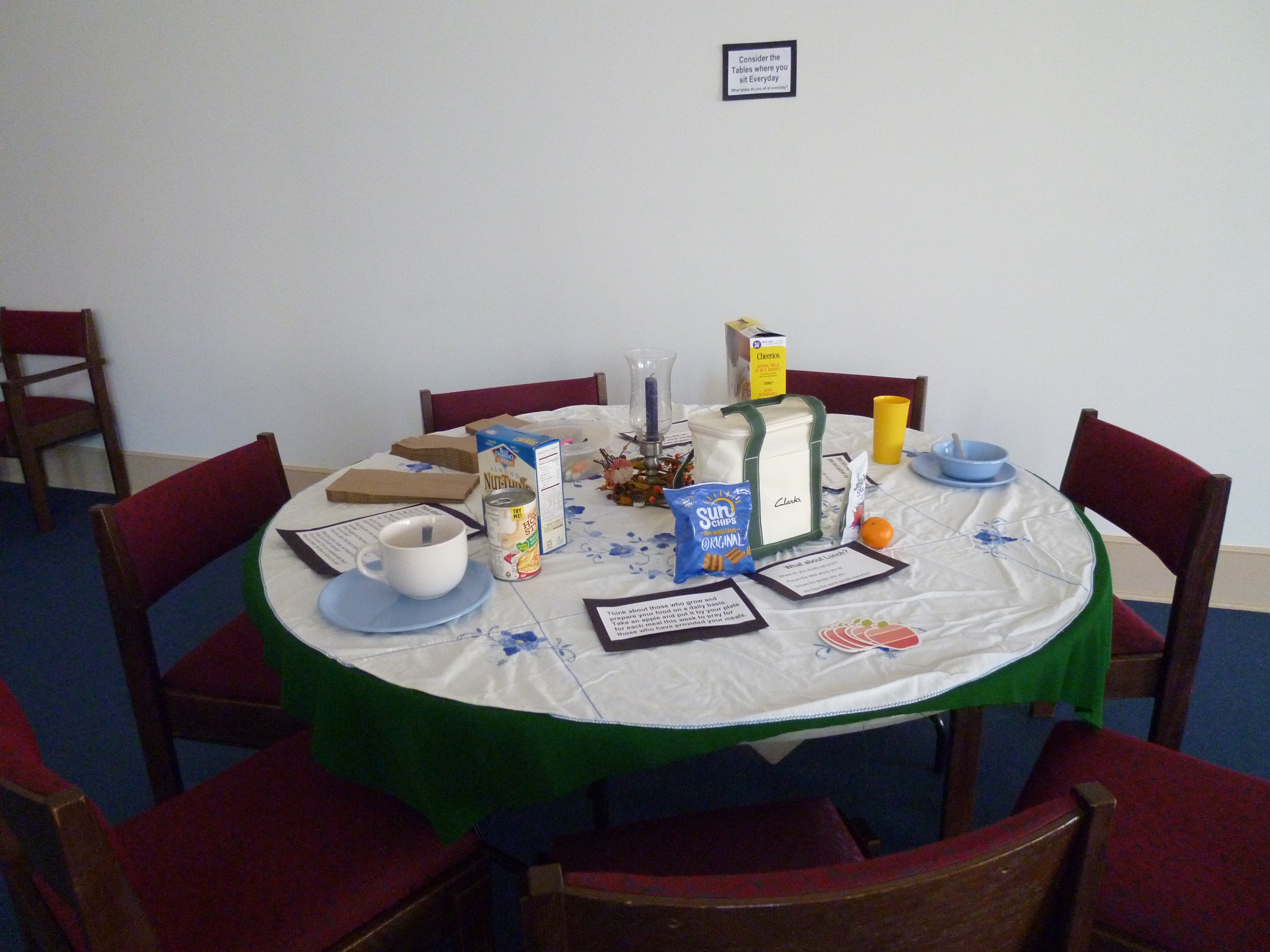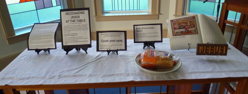Earlier this summer I ran across the work of Lilly Lewin at Free Range Worship. She was the worship leader at the Intergenerate Conference in Nashville and had set up a room under the theme Tables with Jesus, where each table had a different theme from the life of Jesus that engaged the viewer in thoughtful reflection and action. Most of the tables use objects that can be found around the home and all the signs and instructions are available for a reasonable price on her website.