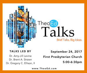The first series of talks will feature: Dr. Amy-Jill Levine, Professor of New Testament and Jewish Studies at Vanderbilt Divinity School; Dr. Brent Strawn, Professor of Old Testament at Emory University; and Dr. Gregory Ellison, Associate Professor of Pastoral Care and Counseling. The inaugural live recording will be held at First Presbyterian Church on the evening of Sunday September 24, 2017 from 5:00-7:00pm in Fifield Hall.