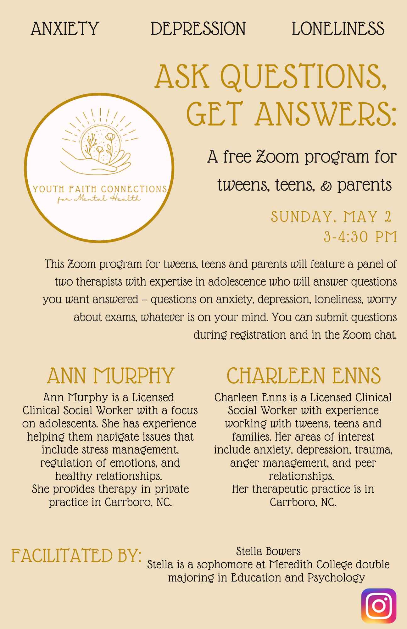 This past January I was asked to co-chair a group of youth in the Chapel Hill/Durham area of North Carolina to create awareness and events around mental health issues for youth in local faith communities. We have 5 on our team right now and they have spent the last few months planning an event taking place over Zoom Sunday, May 2nd. They told us what they needed and the adult chairs worked to help them realize their vision. They wanted to create a safe, anonymous space to have questions answered by experts so parents and youth could hear them. They hope parents will find it helpful to assist their youth and youth hope to learn how to help themselves and their friends.